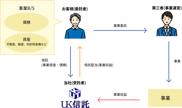 事業者様が、事業の再生や譲渡を目的として、その事業に属する財産や債務を包括的に信託し、事業の経営を第三者に委託するもです。信託の活用により事業の再生や譲渡がスムーズに行えます。