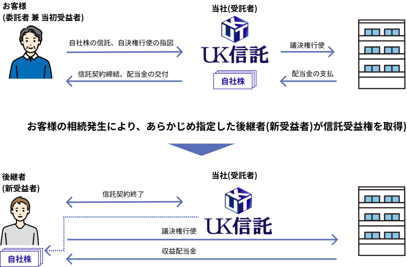 企業経営者様が自社の株式を信託し、信託の財産管理機能を活用することにより、後継者へ円滑・確実な事業承継を図るものです。