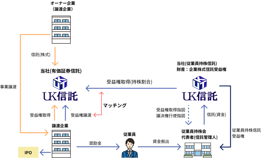 事業譲渡を希望する企業様の株式を信託し、信託の受益権の形で事業の譲受を行うとともに、従業員持株制度を通じて自社株の安定株主の形成を図ります。