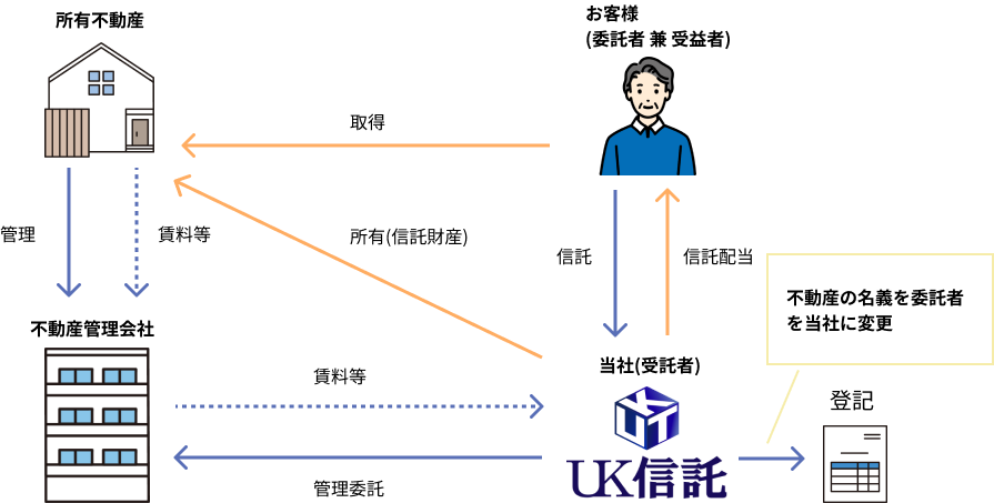 お客様が所有する不動産を当社が信託財産として引受け、お客様に代わって不動産経営に関わる管理会社等との煩わしいやり取りや手続きを行います。